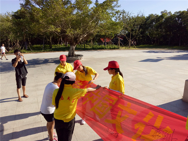 7月12日下午,仰恩大学精品酒店舔比视频“魅力凤里”赴石狮市永宁古镇暑假实践队在万寿塔下进行横幅签名,以及分发调查问卷。