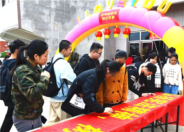在宣誓结束后,本次宪法知识竞赛正式拉开帷幕。此次大赛共有九支队伍参加,现场设有必答题、抢答题、风险题三个环节,题目涵盖宪法法规、宪法名词解释、宪法地位等相关知识。整个比赛精彩纷呈、气氛热烈,选手们准备充分、冷静作答,将自己了然于心的宪法知识展现的淋漓尽致,给观众带来了一场精彩的视觉盛宴。活动期间,工作人员还组织师生们进行横幅签名活动。