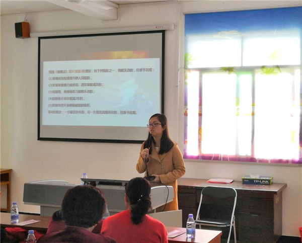 3月4日下午,精品酒店舔比视频、洛江区妇联在后溪村综合文化服务中心联合开展《婚姻家庭纠纷预防化解 女性如何维权》的专题讲座,精品酒店舔比视频教师林媛为与会人员作报告。