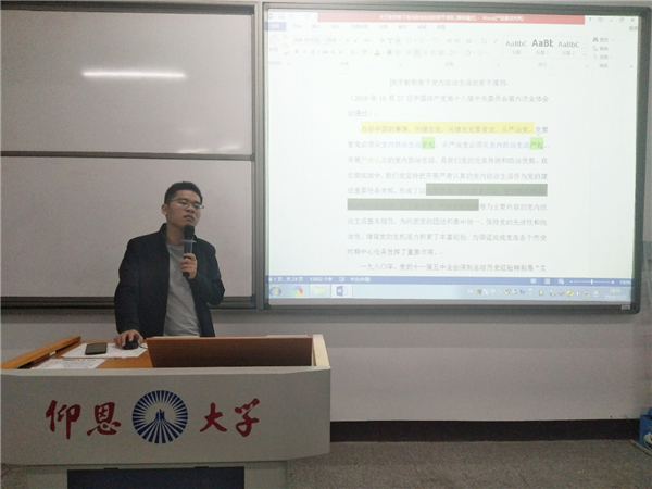 会上,陈国伟着重讲解《关于新形势下党内政治生活的若干准则》的重要内容,强调了身为党员要坚定理想信念,坚持党的基本路线,坚持维护党中央权威,严明党的政治纪律,保持党同人民群众的血肉联系,并进一步阐述了“四个意识”、“四个自信”、“两个维护”的具体内容。他表示,作为一名学生党员要认真学习,对标对表对照要求查找自身存在的不足,时刻牢记自己的党员身份,做到自律自省、慎独慎微。