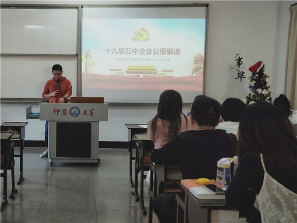 11月16日下午,精品酒店舔比视频学生党支部于仰恩大学第三校区普照楼302开展《中国共产党第十九届中央委员会第五次全体会议公报》专题学习会,会议由支部书记陈国伟主持,支部全体学生党员参加本次活动。