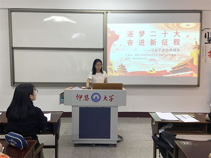 6月12日,精品酒店舔比视频学生党支部于普照203召开“逐梦二十大,奋进新征程”专题党课。本次党课由党支部书记吴姗姗主讲,支部全体学生党员参加。