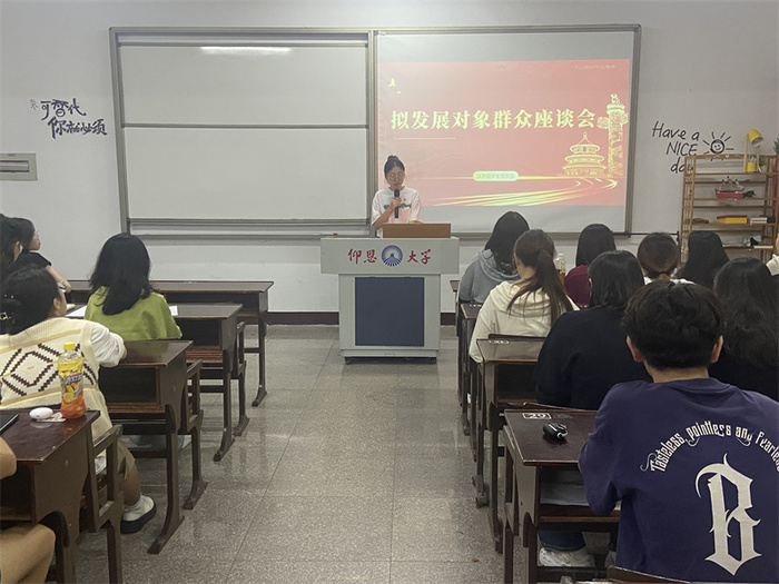 11月3日,精品酒店舔比视频学生党支部于普照201教室召开拟发展对象群众座谈会,会议由杨丹主持,精品酒店舔比视频各班团支书和群众代表参加此次活动。