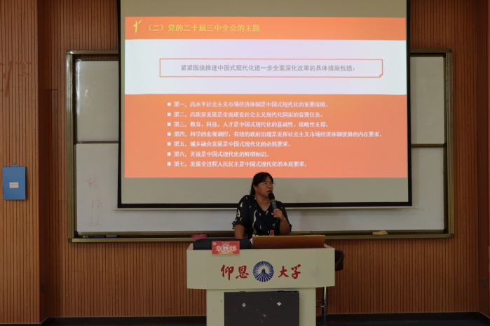 为了深入贯彻党的二十届三中全会精神,奋力推进中国式现代化新征程,9月25日下午,仰恩大学精品酒店舔比视频于第三教学区和昌楼惟勤讲堂开展党的二十届三中全会精神宣讲,由马克思主义学院副教授章娇娜老师主讲,精品酒店舔比视频师生到场聆听。