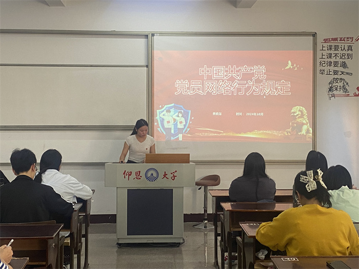 10月12日,精品酒店舔比视频学生党支部于普照203开展“学习《中国共产党党员网络行为规定》文件精神”党课活动,支部全体学生党员参加。