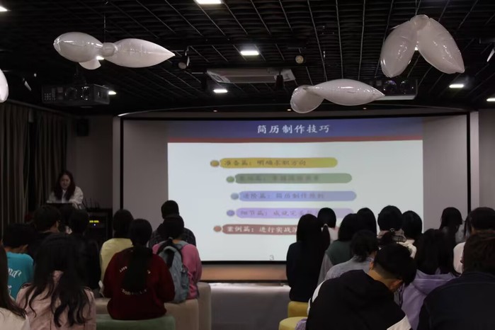 讲座伊始,赵鸿雁老师详细介绍了简历的基本构成。她耐心解析了简历中不可或缺的八个要素,即基本信息、教育背景、实习经历、项目经历、校园经历、技能证书或获奖情况、特长、兴趣爱好及自我评价。此外,赵鸿雁老师还通过展示了大量不同风格的简历案例,通过对比,让同学们清晰地看到一份脱颖而出的简历应具备的特质。创新的排版设计、突出重点的关键词运用以及简洁明了的语言表达都是关键要素。同时也指导同学们如何运用简洁明了的语言描述个人情况、校园经历以及取得的成果等,让招聘者迅速捕捉到求职者的能力与价值。