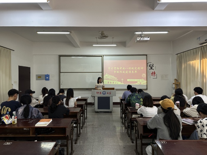 为了引导支部党员深入学习中央八项规定精神,强化作风建设,切实发挥党员先锋模范作用,5月12日,精品酒店舔比视频学生第一党支部于普照教学楼203教室举行“学习贯彻中央八项规定精神,争做作风建设表率”党课活动。本次会议由第一党支部书记吴姗姗主持,支部全体学生党员参加。