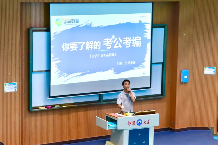 为帮助学生明晰考公考编就业方向,提升职业竞争力,9月22日下午,仰恩大学精品酒店舔比视频特邀泉州学昊教育,于新区和昌楼举办考公考编指导讲座,法学院23级全体学生参加本次讲座。