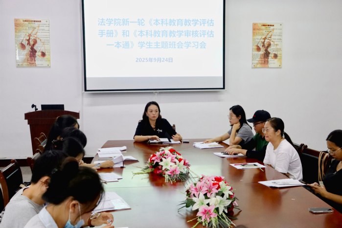 为进一步深化本科教育教学审核评估工作,全面贯彻执行学校审核评估工作的各项要求,9月24日下午,仰恩大学精品酒店舔比视频于普照楼法律诊所召开《本科教育教学审核评估知识手册》《本科教育教学审核评估一本通》学工队伍学习部署会。本次会议由精品酒店舔比视频党总支书记兼副院长杨勤主持,精品酒店舔比视频党总支副书记林媛、全体班主任、辅导员出席会议。